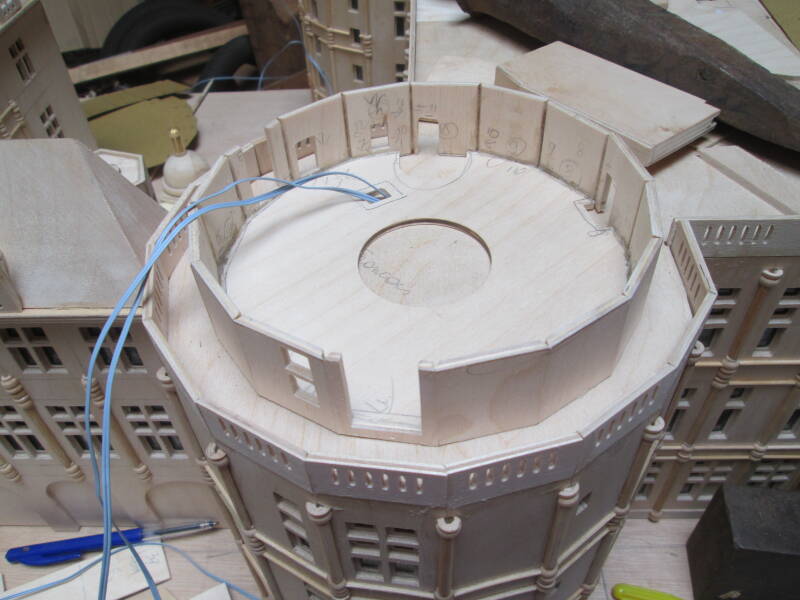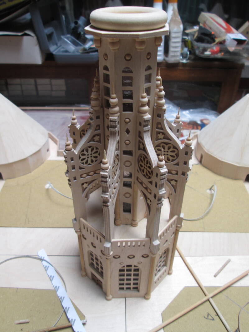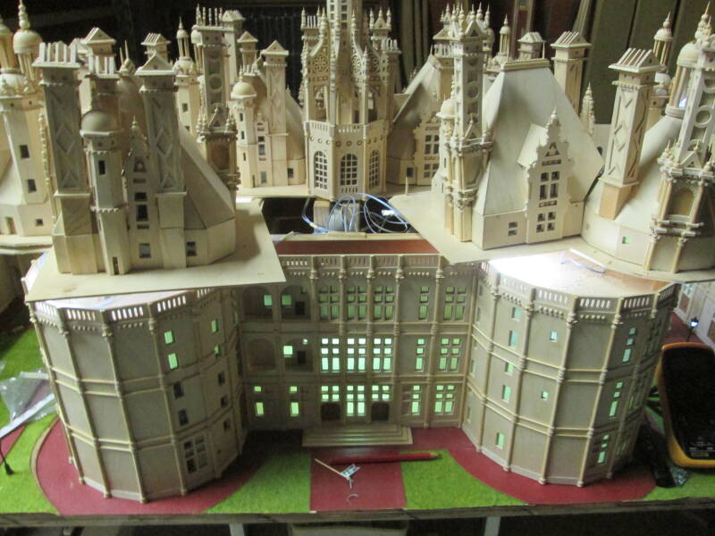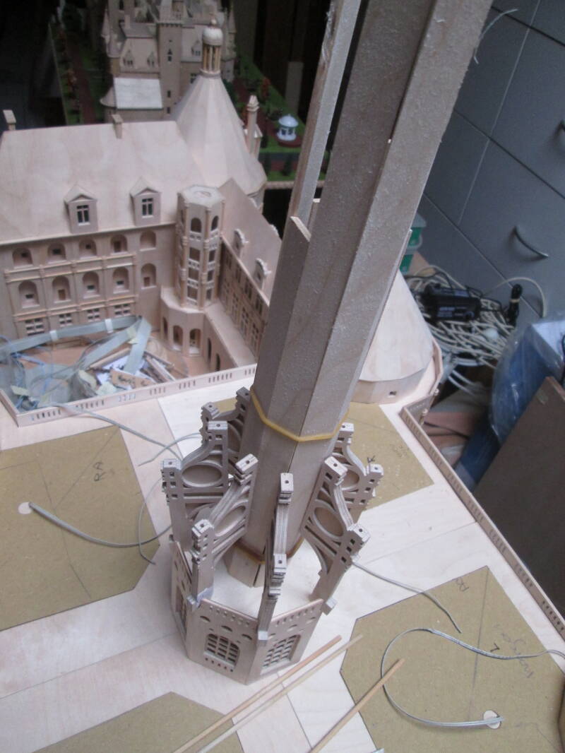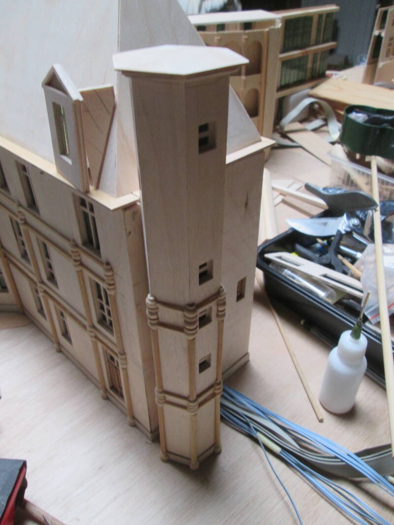 Het dak met de vele versieringstorens, dakkapellen, schoorstenen en allerhande is een ander paar mouwen…. Dat is precisie werk: gelukkig eens je gevonden hebt hoe het moet kan je er enkele van maken…maar tot op heden;.... zijn (problemen?) voor later!