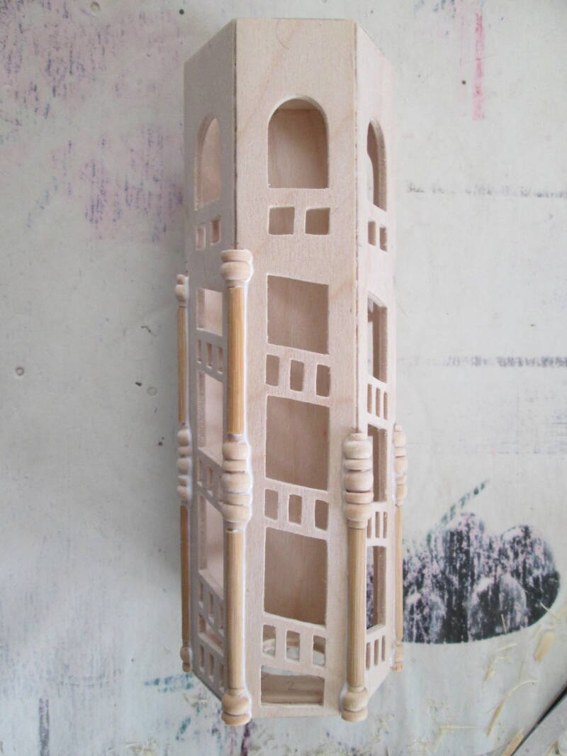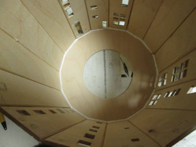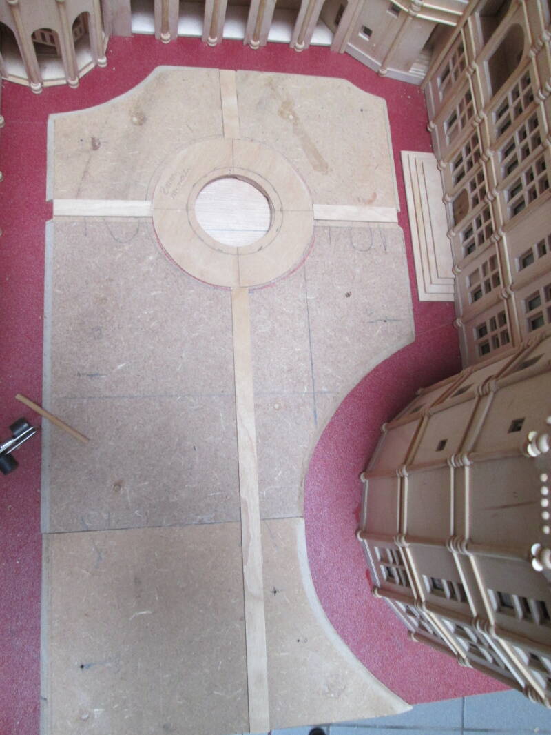 Bij het eerste inzicht lijkt het onderste gedeelte van het kasteel vrij gemakkelijk: de 4 torens zijn (bijna) allen gelijk, evenals de 2 andere van de hoogbouw (uiterste hoeken) Deze zullen een diameter hebben van ongeveer 20cm. Om deze cirkel te maken zal ik deze verdelen in 16 delen…. De onderbouw zonder de lijsten zullen al vlug kunnen gemaakt worden…