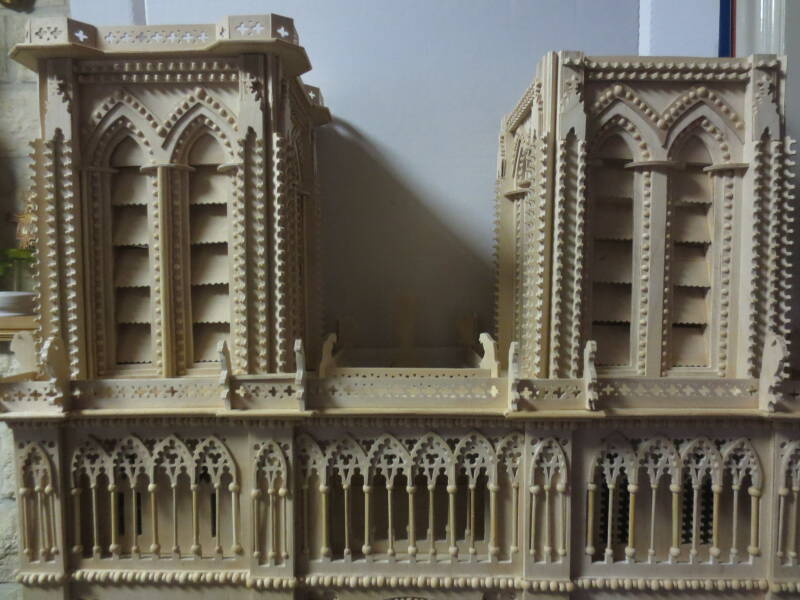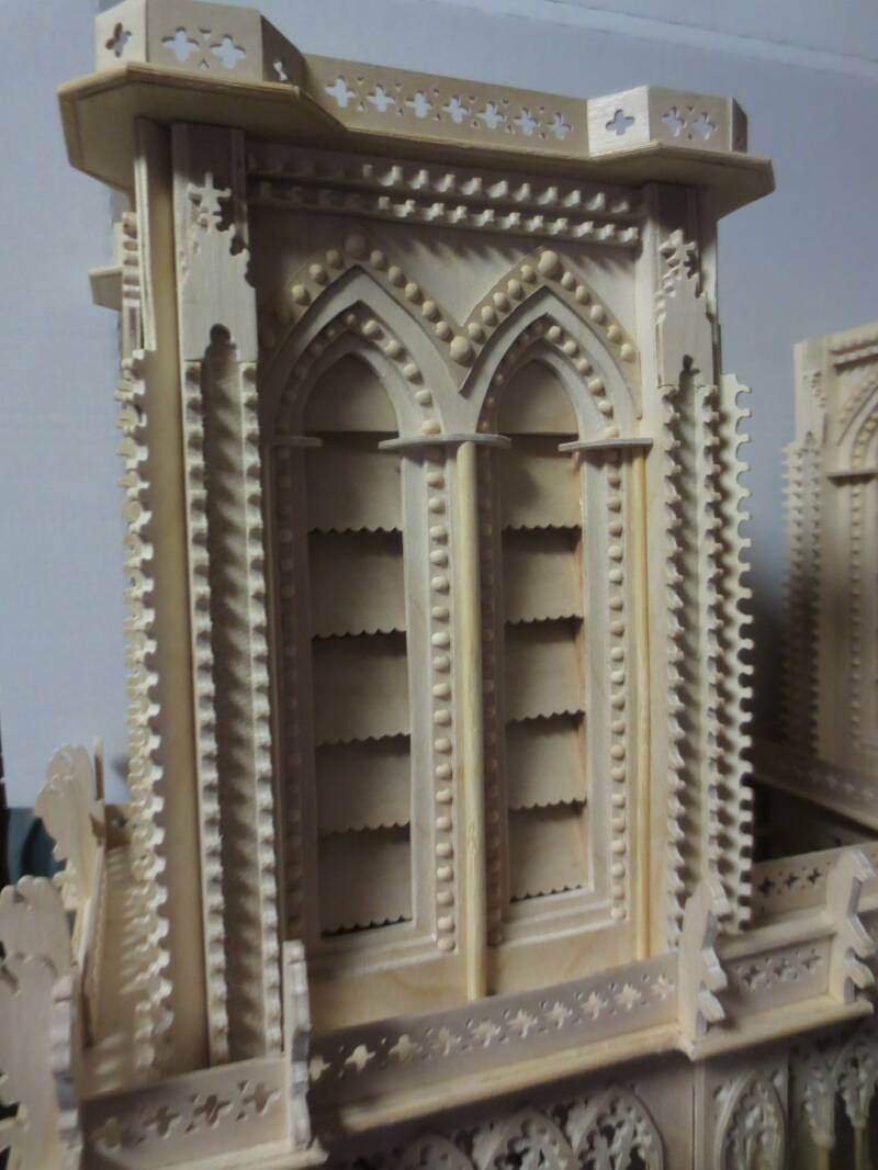 Ook het gotische steenhouwwerk verschilt duidelijk van beide torens: ik heb een keuze gemaakt: maak ik ze zo goed als mogelijk hetzelfde als de originele? Ik opteer om beide torens te voorzien met dezelfde versieringen.